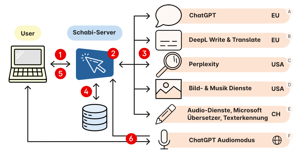 - Wichtig: Der ChatGPT Audiomodus läuft nicht über den Schabi-Server. Der Schabi-Server stellt eine Verbindung zwischen User und Dienst her und speichert das Transkript der Unterhaltung. Die Audio-Daten werden aber direkt zwischen User und Dienst hin- und her geschickt. Der Ort der Datenverarbeitung ist nicht klar, dieser kann irgendwo auf der Welt sein. Der Audio-Modus von ChatGPT nutzt weltweit verteilte Server, diese sind nicht nur in der EU. Ansonsten gelten die gleichen Punkte, wie weiter unten beschrieben.