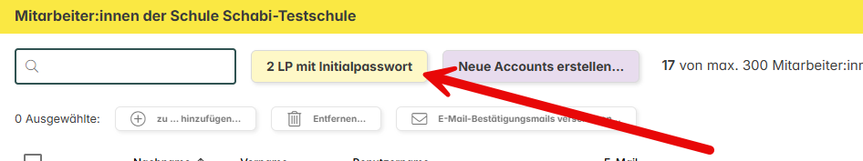 Braucht man diese Initial-Passwörter später wieder, kann die Admin-Person unter "Schulen als Admin" > "Personen" auf "Mitarbeiter:innen" klicken. Nun wird die Liste aller Mitarbeiter:innen angezeigt und falls es Lehrpersonen mit Initial-Passwörter gibt, wird ein Button "x LP mit Initialpasswort" angezeigt: