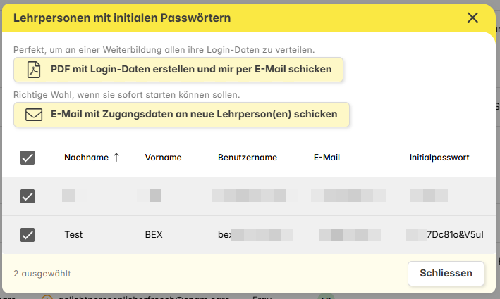 Diese Option ist super, um an einer Weiterbildung allen ihre Login-Daten zu verteilen. Damit bekommst ein PDF mit einer Seite pro erstellten Lehrpeson, auf der der Benutzername und das Initial-Passwort steht. Du kannst diese Seite ausdrucken und den Lehrpersonen verteilen, sobald sie sich bei Schabi anmelden sollen. - E-Mail mit Zugangsdaten an neue Lehrperson(en) schicken: